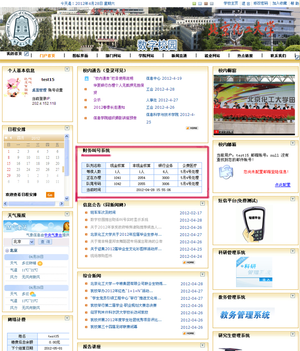 4月下旬,数字校园(门户)推出新组件——“财务前台(报销)实时叫号系统”。该系统是由财务处与信息中心合作开发的应用组件,能够实时显示财务处前台报销业务的取号、排号、叫号情况,目前已经在数字校园中显示并为全校师生服务。我校师生登录门户后在门户首页中可以实时在线浏览财务处日常业务状况,欢迎师生员工登录使用。