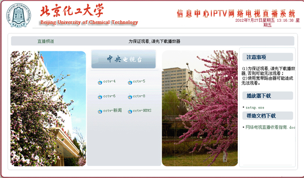 为丰富校园文化生活,建设和谐校园。信息中心在2012年奥运会前夕,推出IPTV网络电视直播系统,全校师生只要在校园网内都可以免费、免流量登录观看电视节目,从门户登录(http://my.buct.edu.cn)进入后在最右侧列中可以看见“IPTV网络电视直播系统”模块,点击进入即可观看。目前该系统仍在试用期,学生宿舍6号楼、7号楼、综合楼、工程楼、有机楼、无机楼、教学楼、化纤楼、图书馆可以使用,学生宿舍1号楼及科技大厦正在测试中,学生宿舍2-4号楼及北区将在下一阶段测试。电视节目现仅有CCTV新闻、CCTV5、CCTC6、CCTV8等6个频道,登录网站后请先下载并安装播放器,而后下载播放列表,就可以选择观看电视节目了,欢迎大家试用,如有问题请联系信息中心64433224。