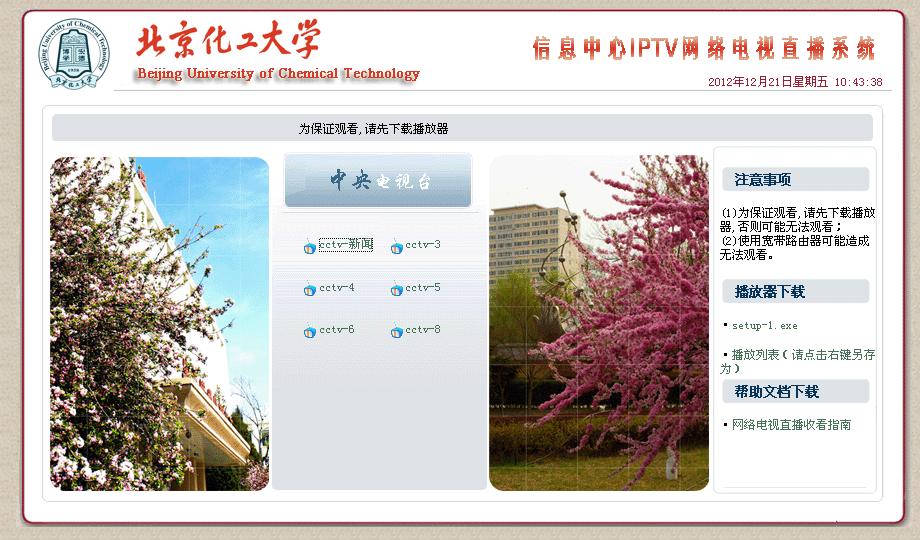 12月21日,数字校园内的电视直播系统正式运行,转播CCTV-新闻、3、4、5、6、8共6个节目。为便于观看,请先安装VLC播放器(目的是安装使用浏览器观看的插件),这样就可以通过网页进行浏览了。如有问题,请您联系信息中心,联系电话64436226、5227、4922。