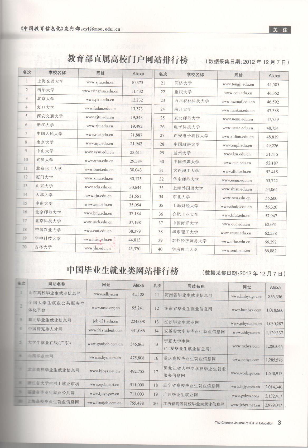)在教育部直属高校门户网站排行榜中名列第11名。《中国教育信息化》期刊由教育部主管,教育部教育管理信息中心主办。