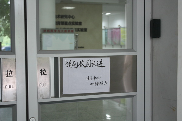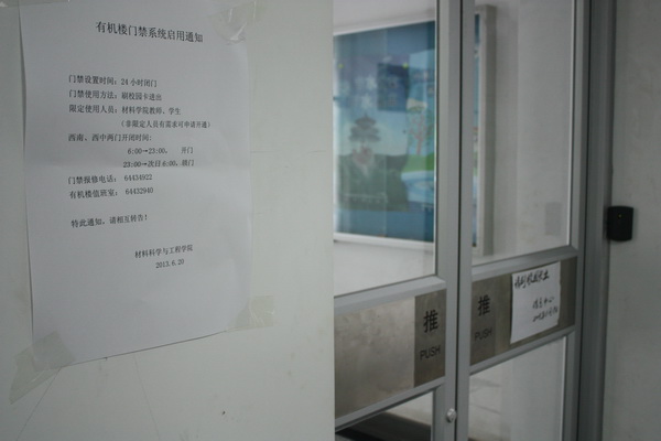 6月19日,由信息中心负责的计算机楼北门、有机楼门禁系统开始试用。试用期间,出入此门的所有人员都需要使用校园一卡通进行刷卡,请大家爱护相关设备,不要强行推拉进入。如有问题,请联系信息中心,联系电话64436226、64435227。与此同时,机械楼、综合楼、化纤楼、化机楼、科技大厦的门禁系统仍在调试中,近期将会通入试用。