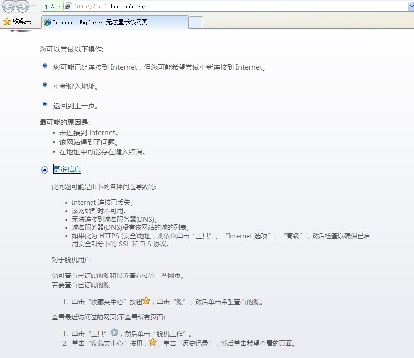今早8点,信息中心陆续接到电子邮箱(mail.buct.edu.cn)网站不能正常访问的保修电话。中心相关负责老师立即进行处理,经初步查看,邮箱系统可以通过202.4.130.61直接访问,也可通过outlook或foxmail客户端收发邮件,但输入http://mail.buct.edu.cn后却无法访问页面。截止到上午9:30,邮件系统已恢复正常访问,但原因仍在排查中。