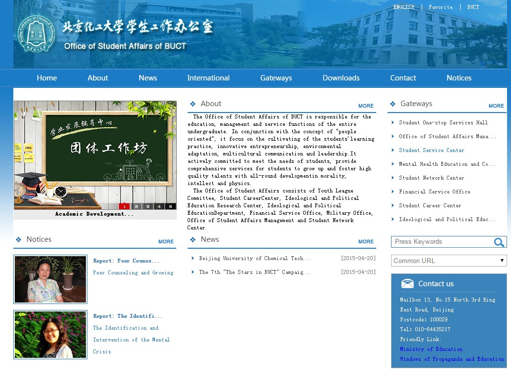 5月7日下午,学生工作办公室英文网站(http://en.xgb.buct.edu.cn)上线试运行。该网站是由学生工作办公室和信息中心的合作与共同努力下经历了一个月的建设工作而完成的。目前,我校英文网二级学院网站都已上线运行,二级部处及直属单位仅有国际交流与合作处、学生工作办公室上线,其他英文网站仍在建设中。