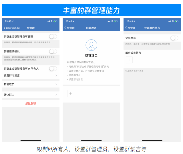 办公场景下的群管理能力:群管理员、禁言