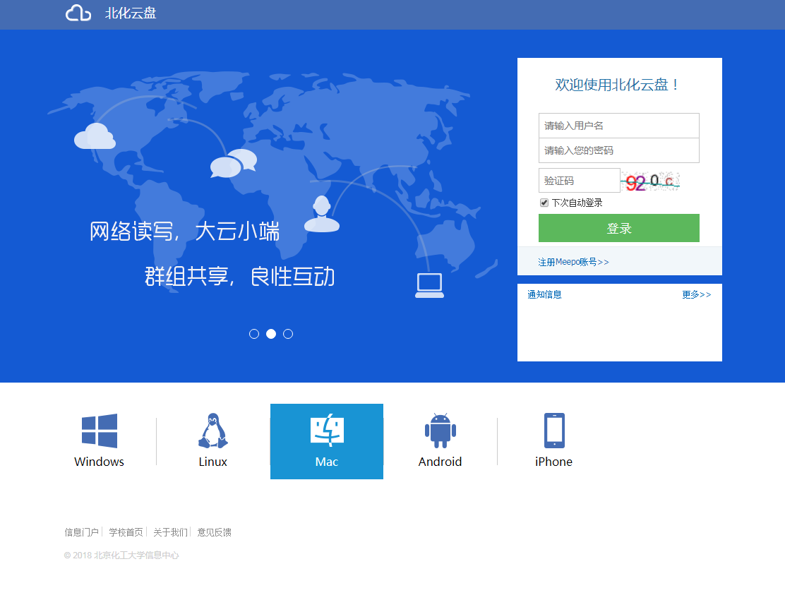 学校自2014年开通了北化云盘,为全校师生提供数据存储和数据分享。校内访问方式:网页端及windows、mac、linux客户端及iphone、Android手机客户端,校外可通过VPN访问,帐户密码与上网账号密码相同。