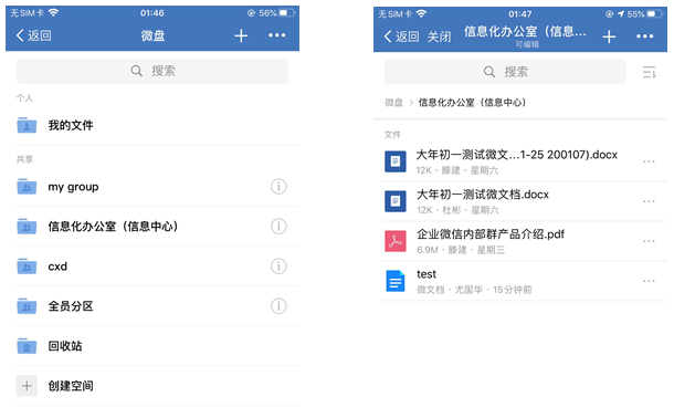 学校已在全校范围内部署了企业微信应用,人员数据实现了和学校人事系统、教务系统、研究生管理系统的自动同步,对教职工自动建立了部门群,方便同事之间相互交流。企业微信提供了微盘功能,为群里的同事创建共享空间,里面的文件修改实时同步,每次打开都是最新版本。