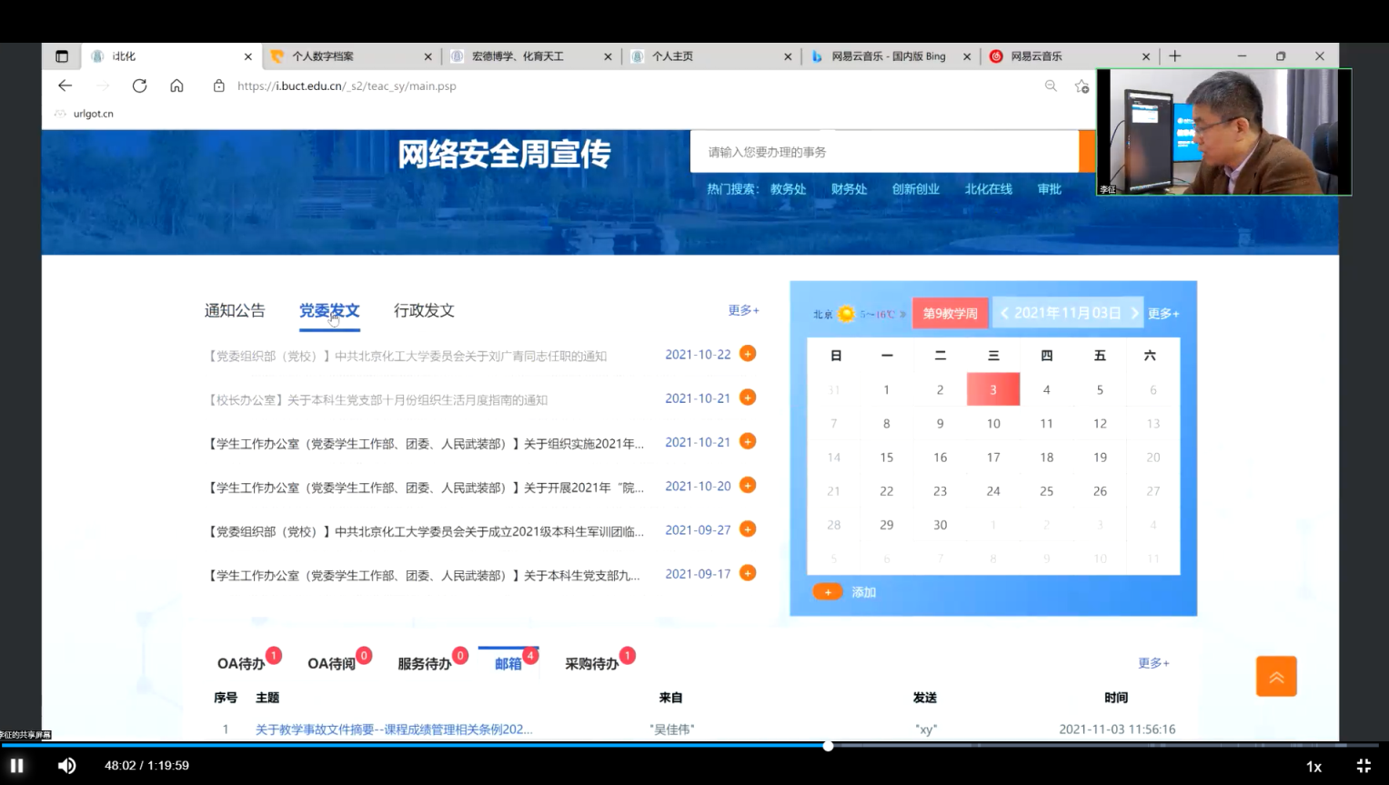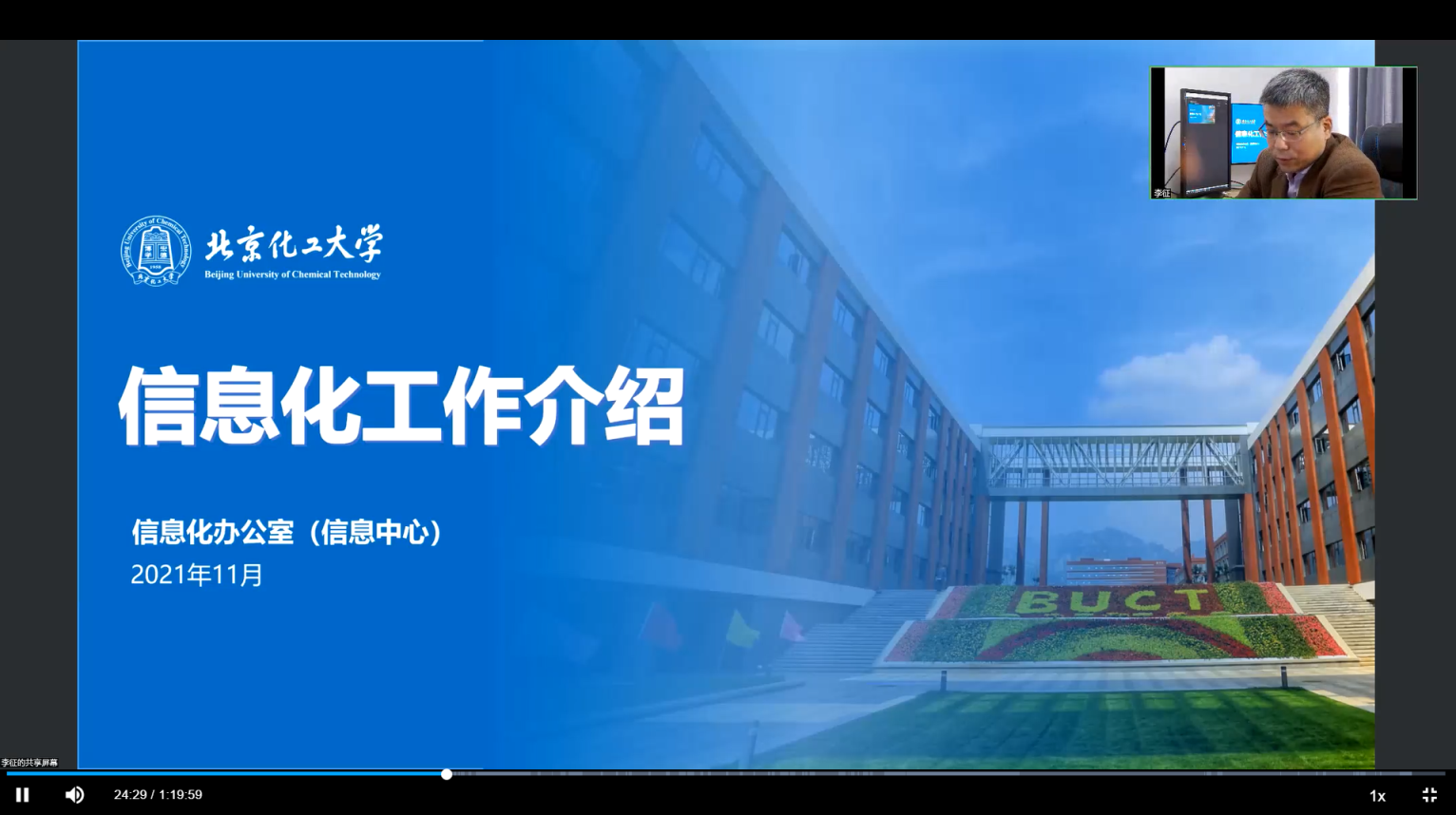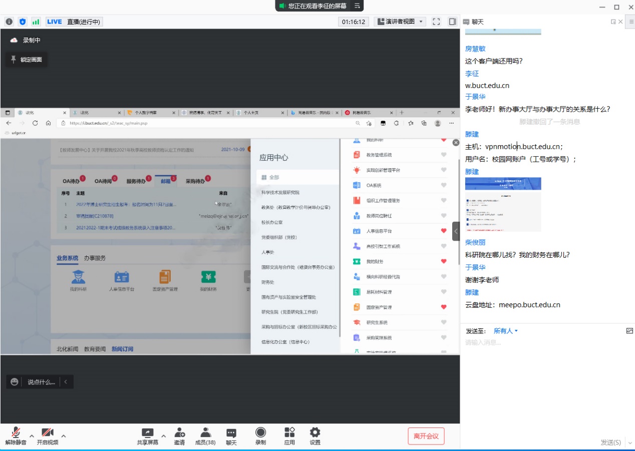 随后,李征主任重点演示了新上线的“i北化”信息平台的使用方法和技巧。“i北化”将校内各类资讯、流程服务、业务系统等信息资源统一聚合,并按照师生身份和功能业务做合理划分,让师生能够对校内各类信息资源一站式访问。通过举办此次线上培训会,广大教职工进一步了解学校信息化建设工作,并提升了信息化系统应用能力。