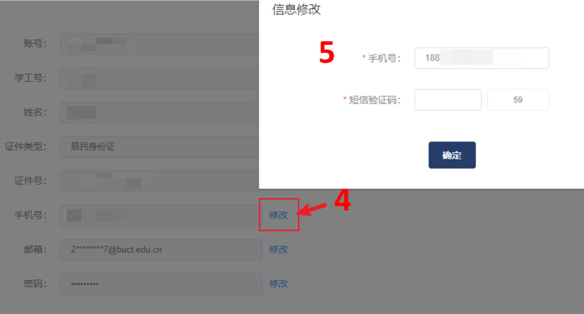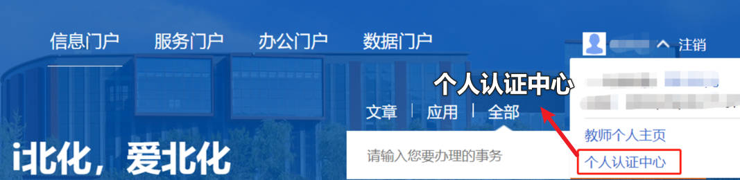 访问i北化校园门户https://i.buct.edu.cn(校外可通过w.buct.edu.cn访问),点击右上角个人姓名后的小三角进入个人认证中心修改手机号,如下图所示: