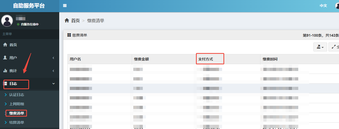 2、点击左侧【日志】,【缴费清单】,查看近期网费的【支付方式】,支付方式是“现金“或“一卡通”可以办理退费;若支付方式为“转账“,其余额只能转账到同部门其他校园网账户。