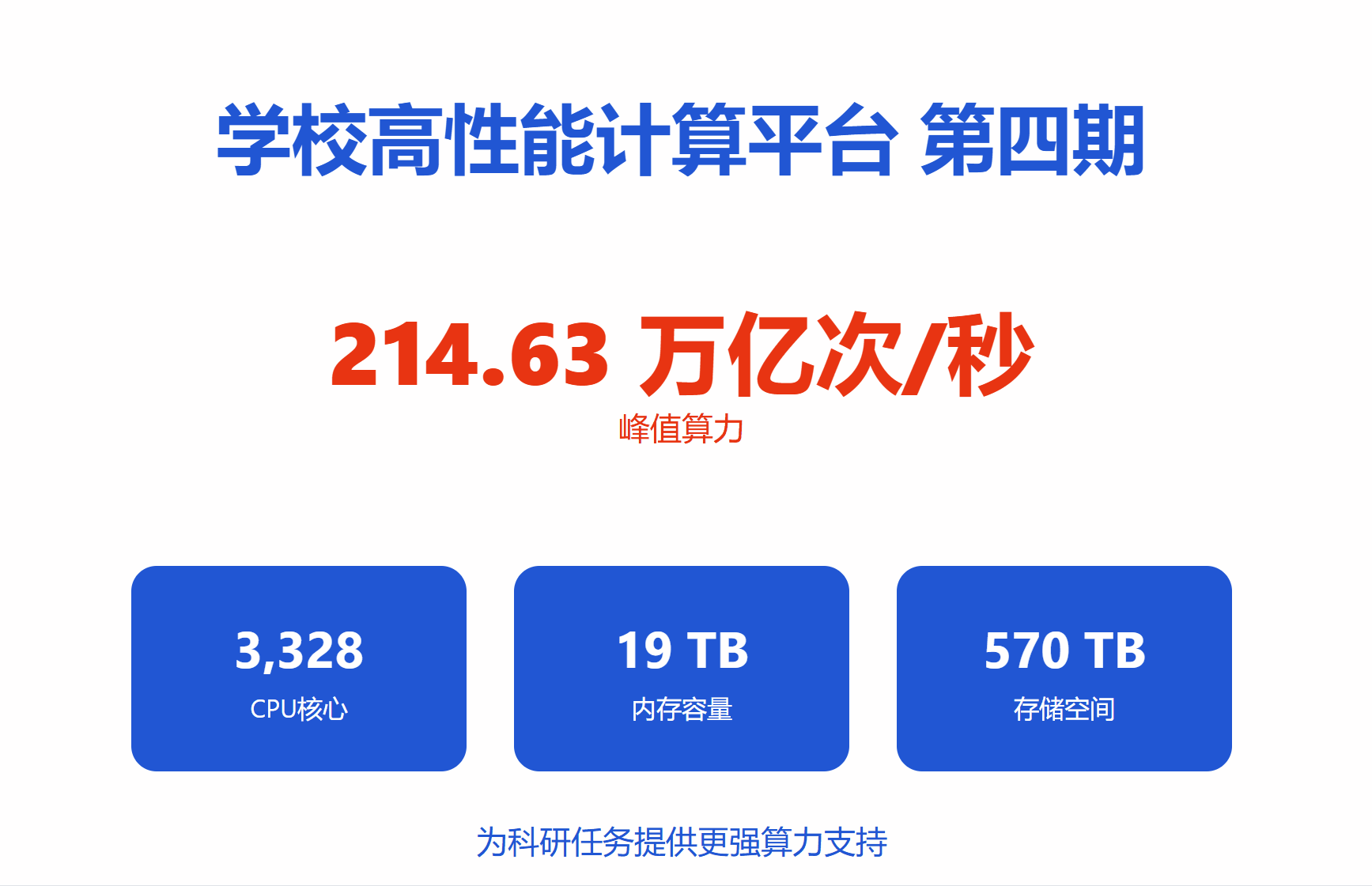 “十四五”期间,学校高性能计算平台经过多期建设,为科研任务提供强大算力支持。即将上线的第四期平台新增50个计算节点、3328个CPU核心、19TB内存和570TB存储空间,峰值算力达到214.63万亿次/秒。