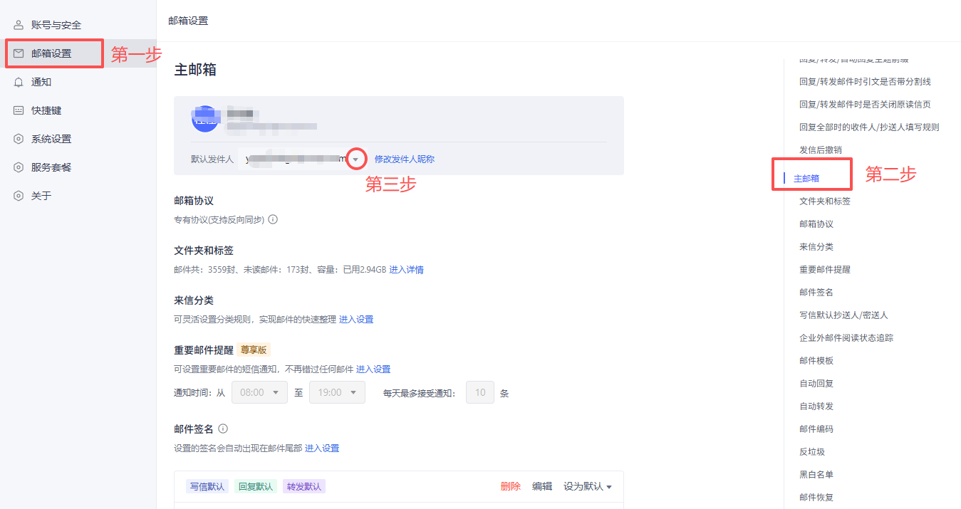 登陆web端:https://mail.buct.edu.cn, 按下图标记的“1、2、3”步骤点选【设置】-【邮箱设置】-【主邮箱】选择默认发信人,这样您之后发信显示的是此处选择的发信人。例如:您在此处选择了默认发信人为您的别名邮箱,那么即使您通过企业微信扫码登陆进入到您的工号主邮箱进行发信,显示的发信人依然是您的别名邮箱地址。