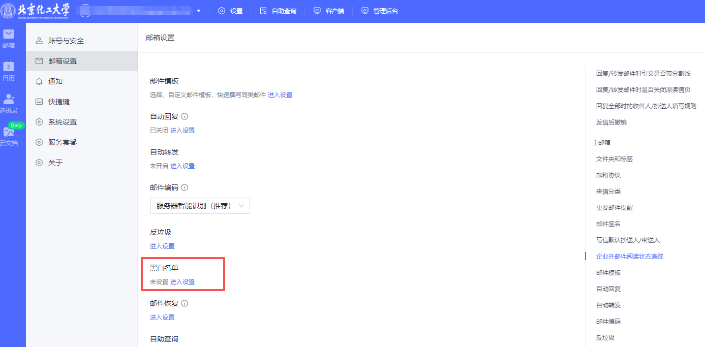 登陆web端:https://mail.buct.edu.cn, 按上图标记的“1、2、3”步进入主邮箱相关配置项,下滑找到黑白名单配置项,进入设置