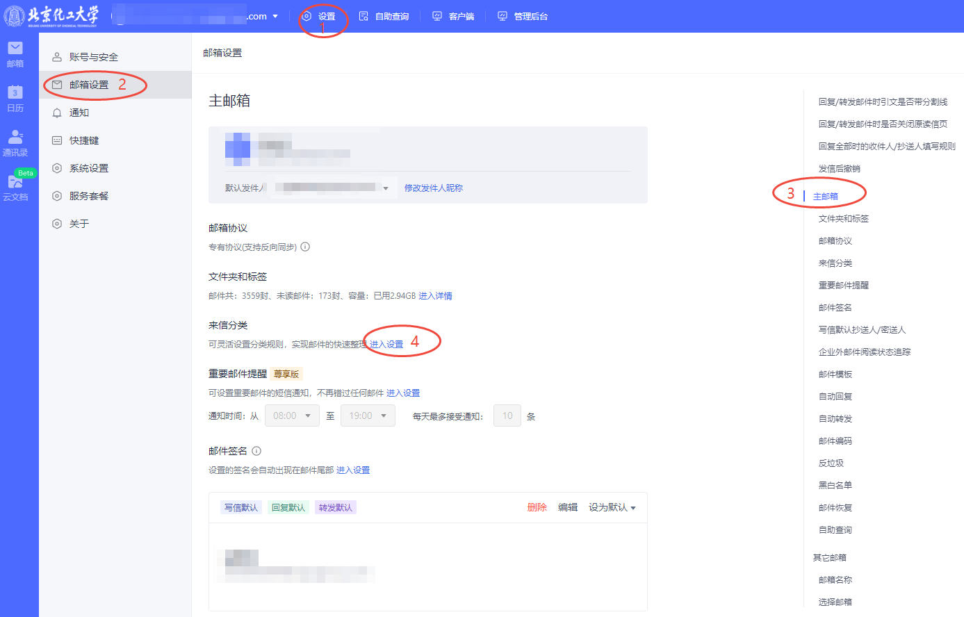 登陆web端:https://mail.buct.edu.cn, 按下图标记的“1、2、3、4”【设置】-【邮箱设置】-【主邮箱】-【来信分类】,【进入设置】的步配置来信分类规则。