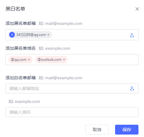 (2)支持添加单个邮箱和域名级别的黑白名单,当需要添加多个时,每输入完成一个地址,按 “回车健”后,可继续输入下一个,如图所示。